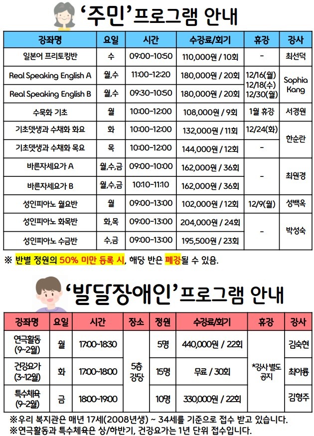 - 주민 및 아동 프로그램은 최소인원 등록 시, 시니어프로그램의 경우 정원의 50% 미만 등록 시 폐강될 수 있습니다.